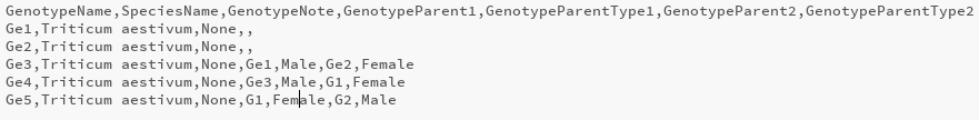 | Genpedigree Start Column | Begins a genotype name and genotype pedigree type pairings. Use genotype names and type names. |