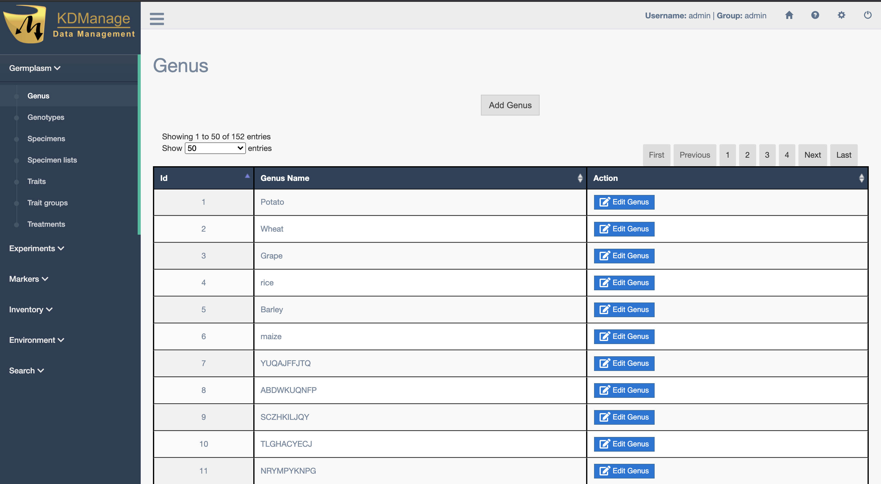 The Genus Page contains a list of all genus that are contained in KDDart. Genus refers to a logical grouping of genotypes which may optionally be botanically related.