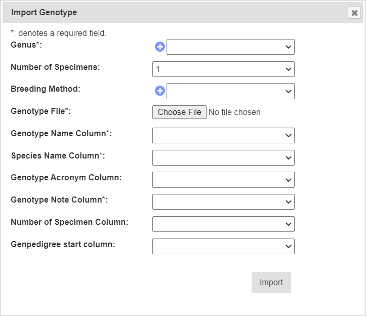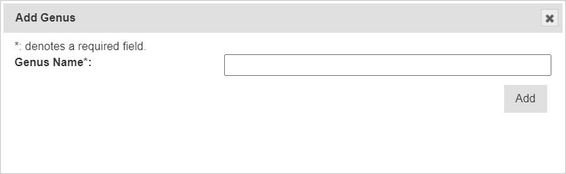 | Genus | Mandatory | The name of the genus that the gennotype belongs to. Select the or go to the Genus Page to create a new genus. |