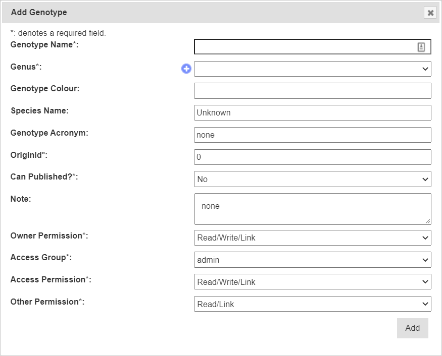 | Other Group Permission | M | Dropdown to select the other groups’ permissions to given genotypes. |