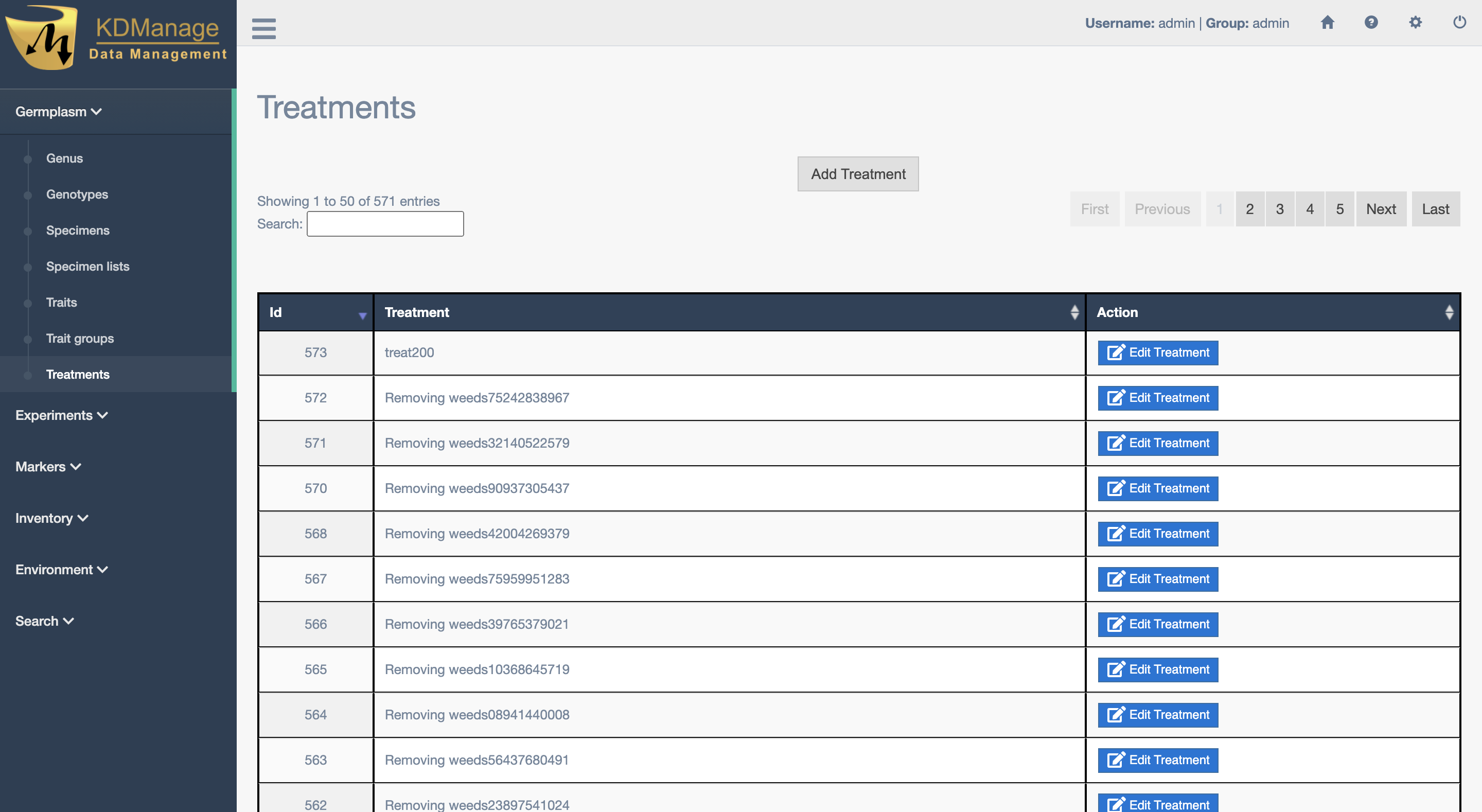 Treatment describes or quantifies an action performed on a trial unit to induce a measurable response, such as to a certain level of fertilisation (e.g. adding nitrogen) quantity of irrigation, etc. The Treatment Page lists all treatments that are available in your KDDart instance.