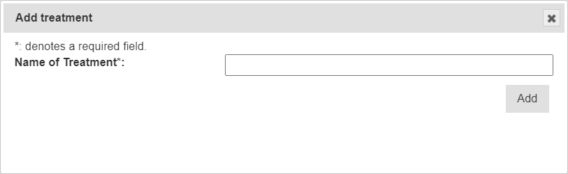 New treatments can be added by selecting the Add Treatment Button which displays the Add Treatment Window as seen in the image below: