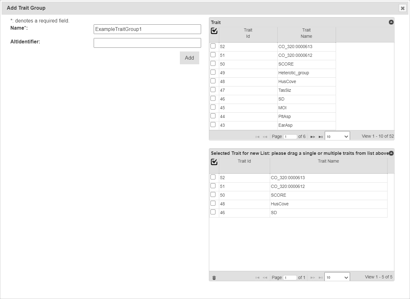 New trait groups can be created by selecting the Add Trait Group Button which will display the Add Trait Group Window (see below) where a name for the new group and traits can be selected.