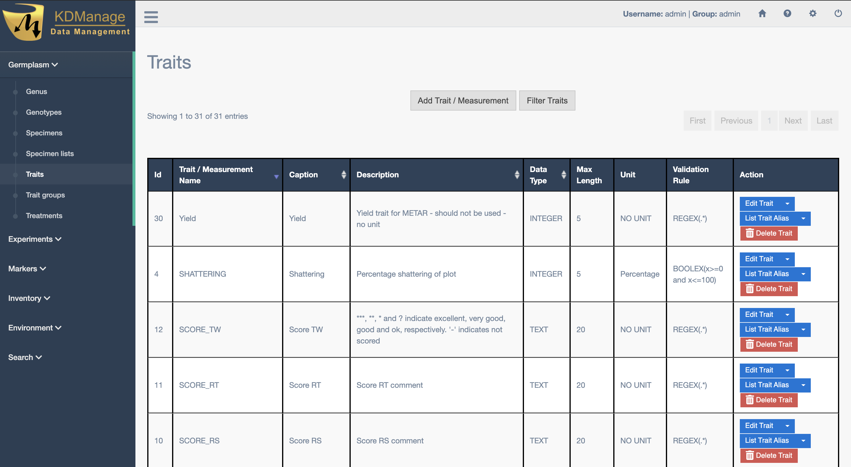 Traits are important descriptors of what is to be measured and what the permissible values are in those measurements. The Trait/Measurement Page enables the definition and quantification of a trait or characteristic of the trial/experiment. This includes a description and notes, the data type, units of measurement, maximum value and validation rule.