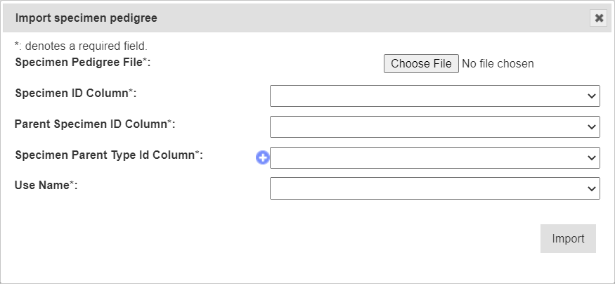 | Pedigree Column | (Only required if creating specimens) The column that contains the pedigree for the specimens to be created. | |
